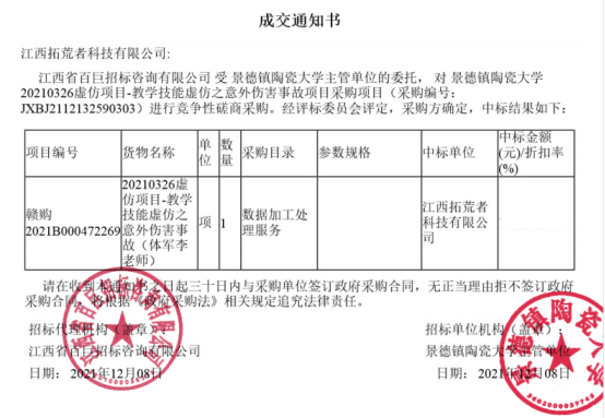 我司在“景德镇陶瓷大学虚仿项目-教学技能虚仿之意外伤害事故项目”招标中,从众多竞争对手的角逐下脱颖而出,一举中标。本次中标,再次见证了我公司全体员工的辛勤付出。过硬的产品质量、雄厚的虚仿技术、合理的价格、诚实守信的经营方式、完善的服务体系,让我们这次能在众多公司中崭露头角。